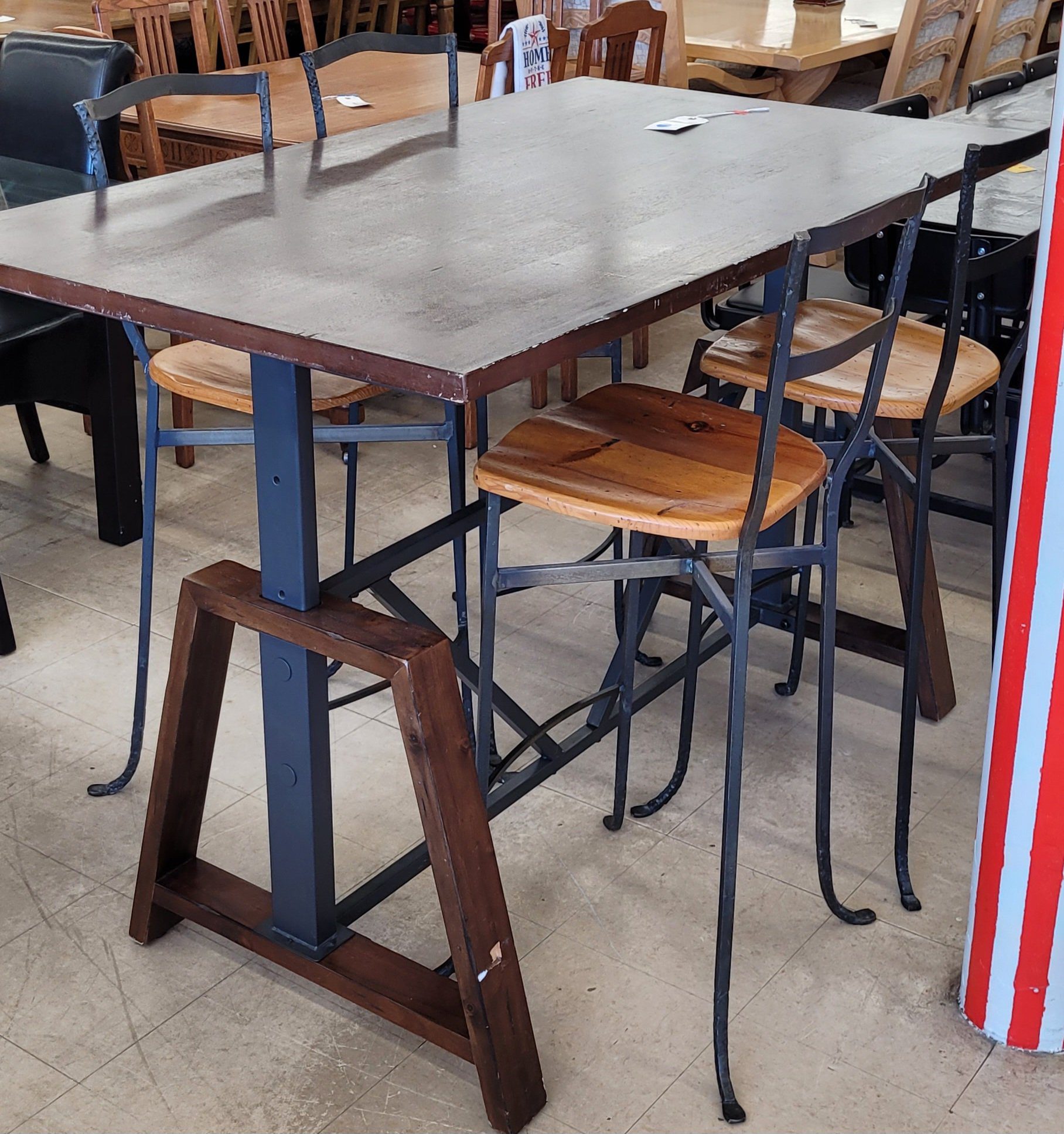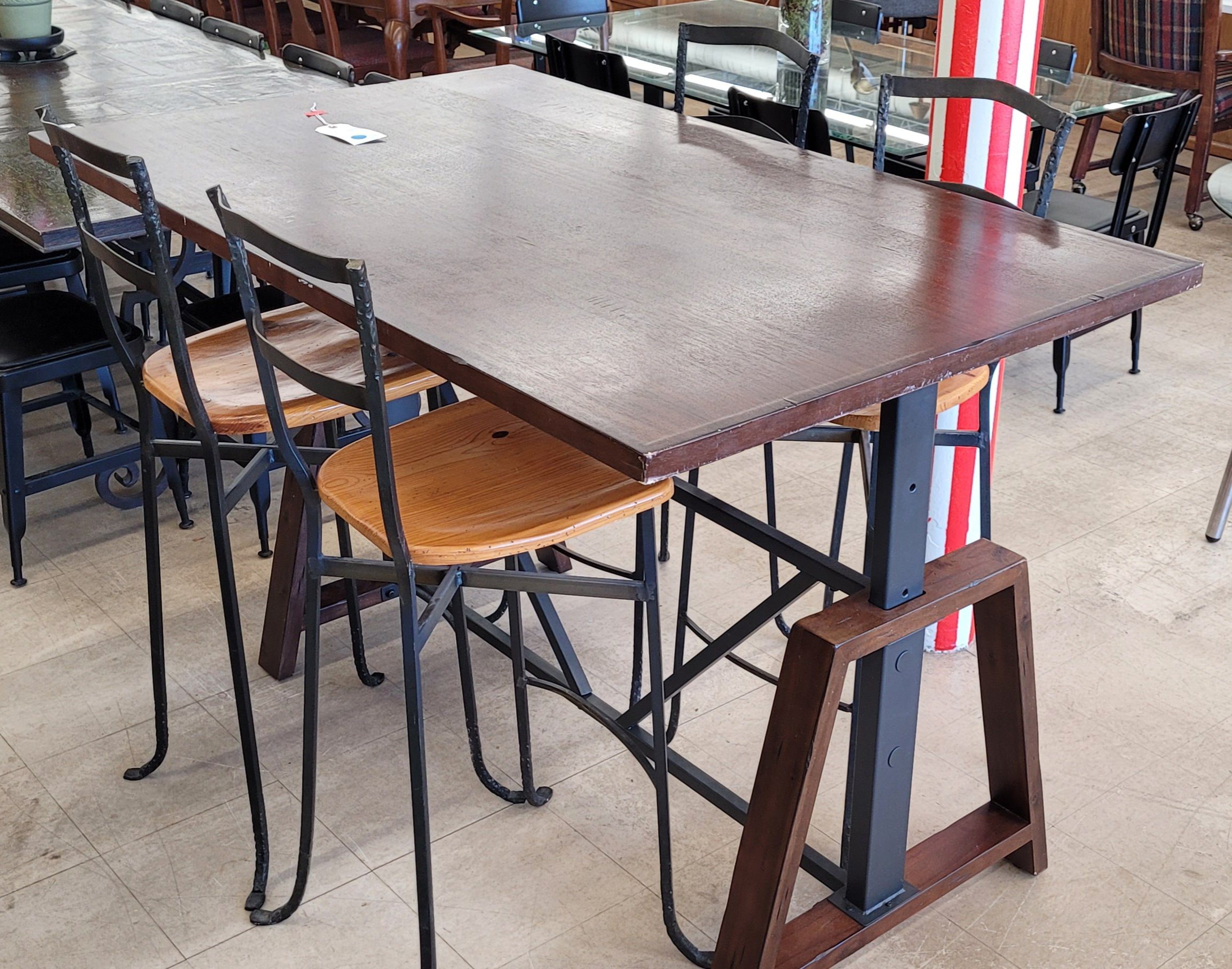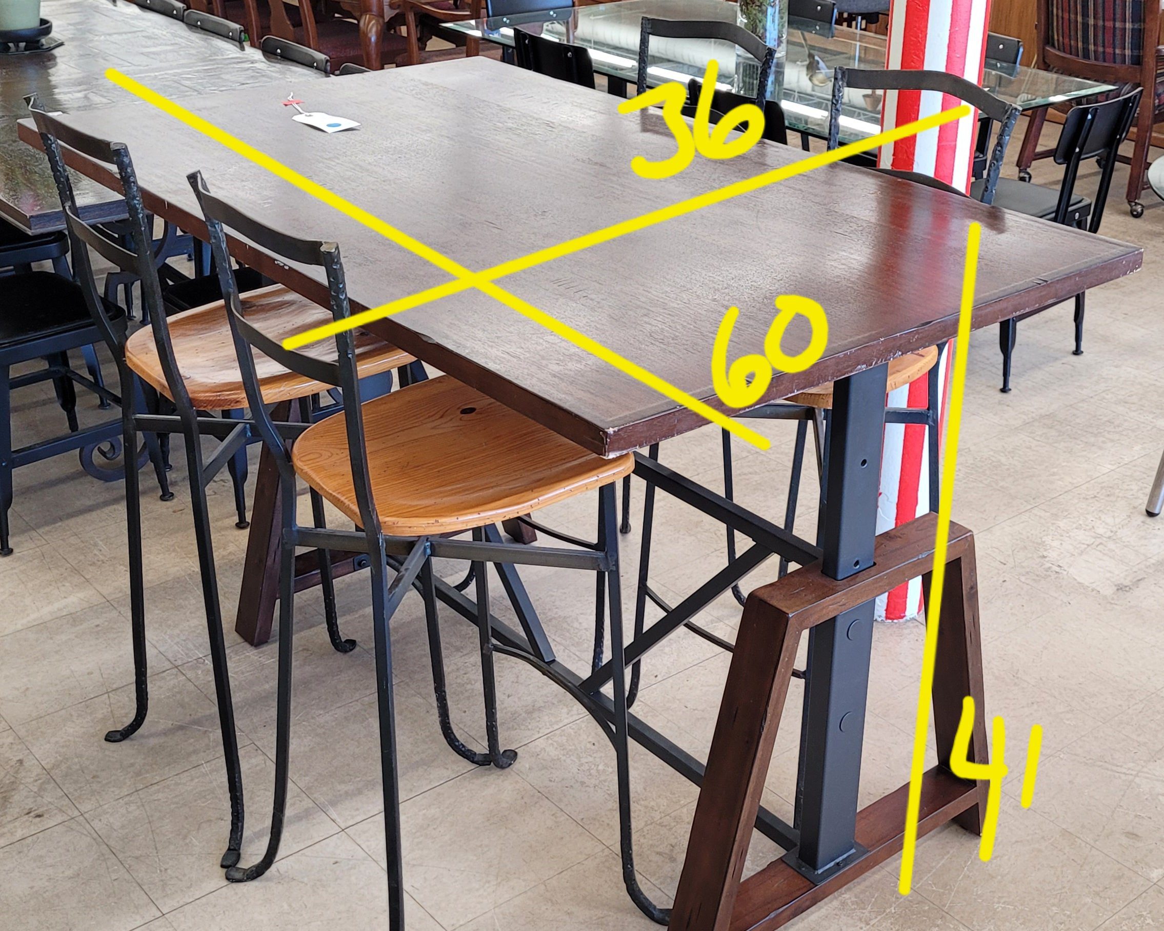 Great adjustable height table with 4 chairs available. This is pretty cool, as you can go from bar height all the way down to standard dining height. The table itself is adjustable but the chairs are not, so some planning is required. Made from solid wood and steel, this table is in good condition, and the wood and iron chairs are also in good condition. From a clean non-smoking home.