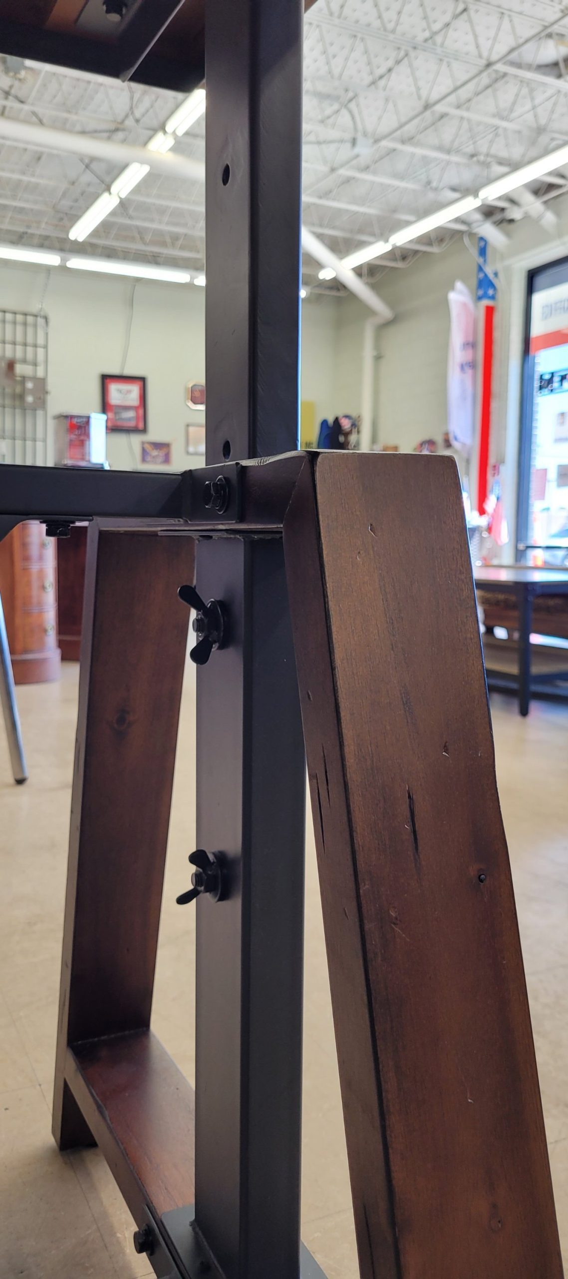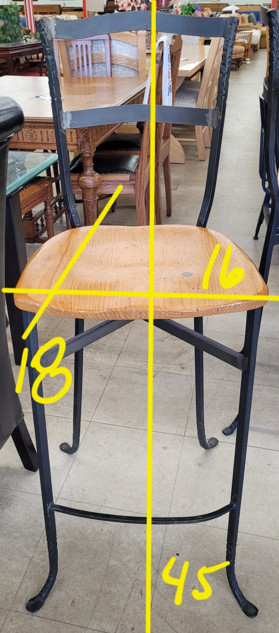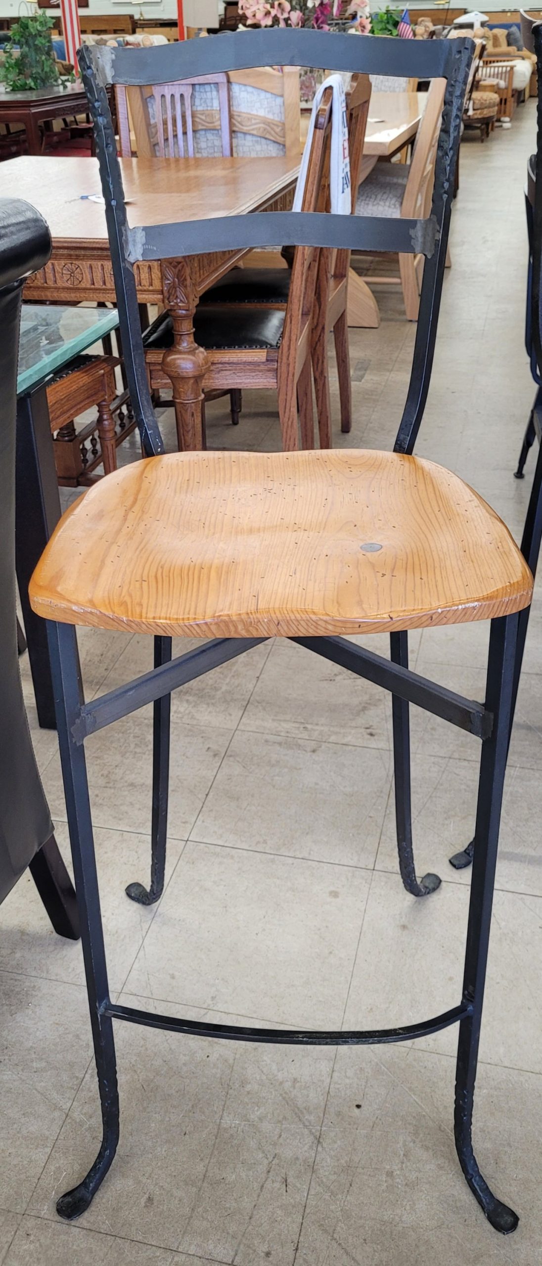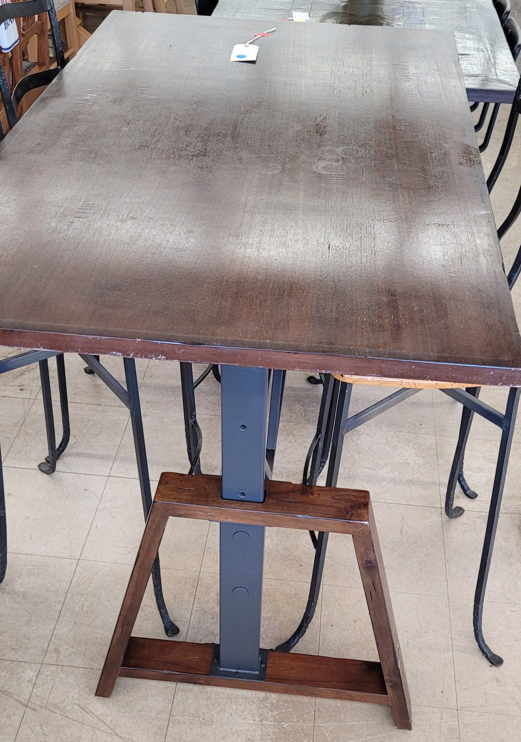 Great adjustable height table with 4 chairs available. This is pretty cool, as you can go from bar height all the way down to standard dining height. The table itself is adjustable but the chairs are not, so some planning is required. Made from solid wood and steel, this table is in good condition, and the wood and iron chairs are also in good condition. From a clean non-smoking home.
