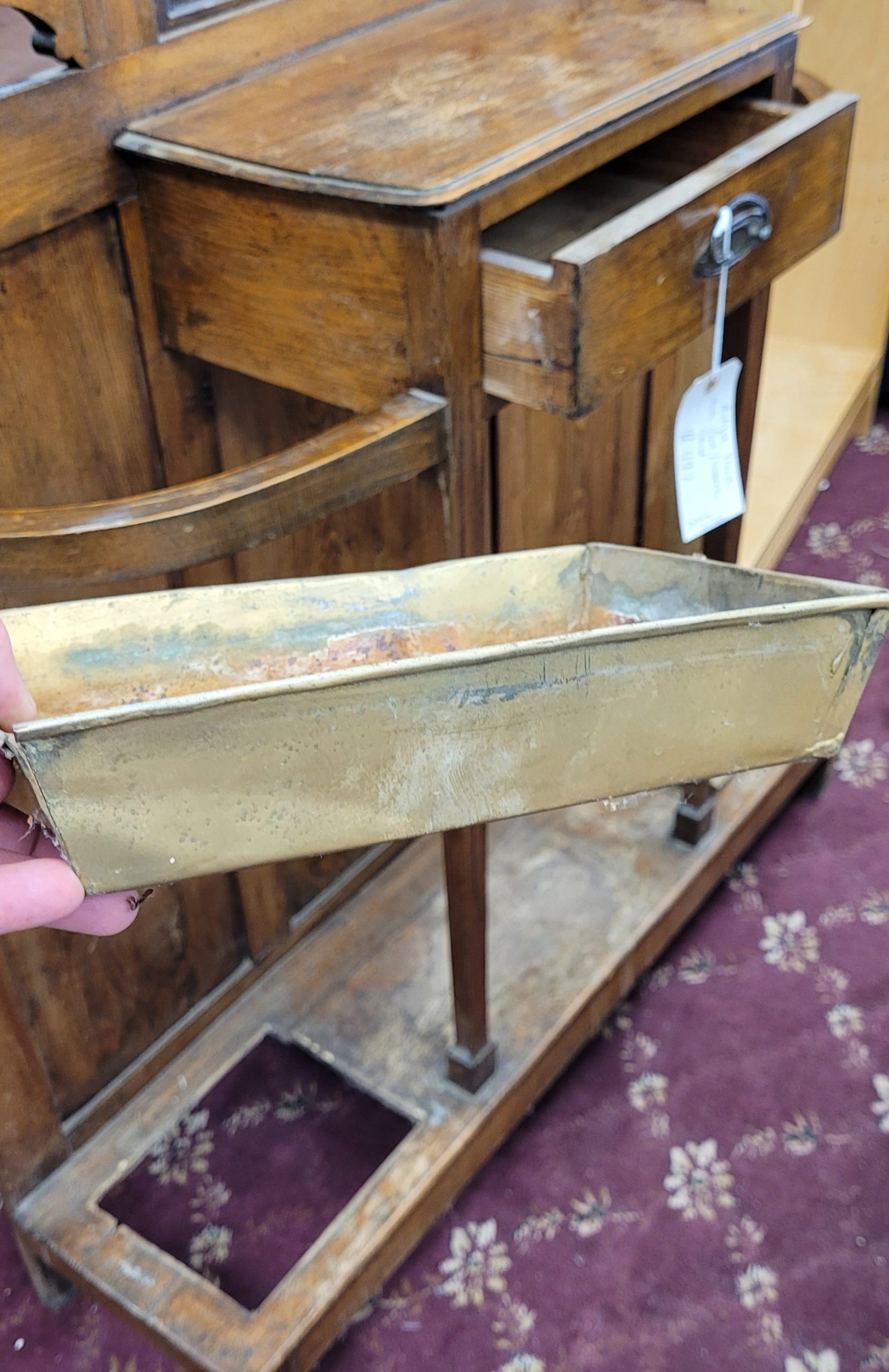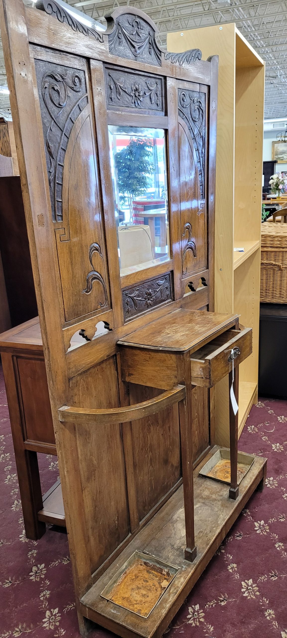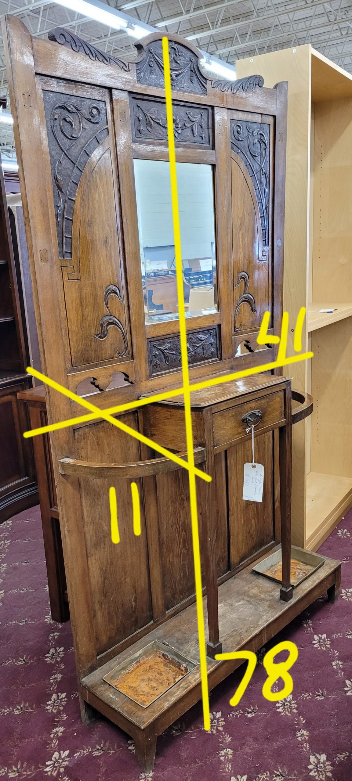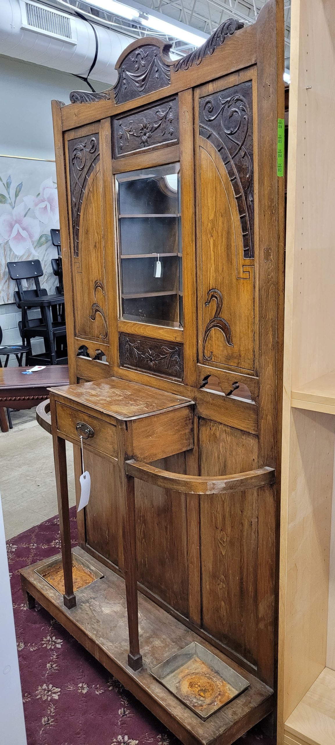A real piece of history for sale here. This antique hall rack for your coats and umbrellas is a real treasure. Tin catch pans at the bottom catch all of those raindrops that are stuck to your umbrella. A mirror to check your appearance before hitting the town too. One small drawer for keys or other small items. This rack has had the coats hooks removed, so they will beed to be replaced. From a clean non-smoking home.