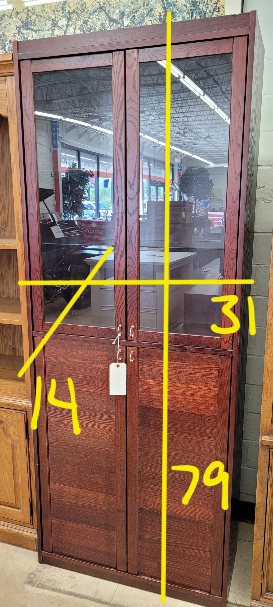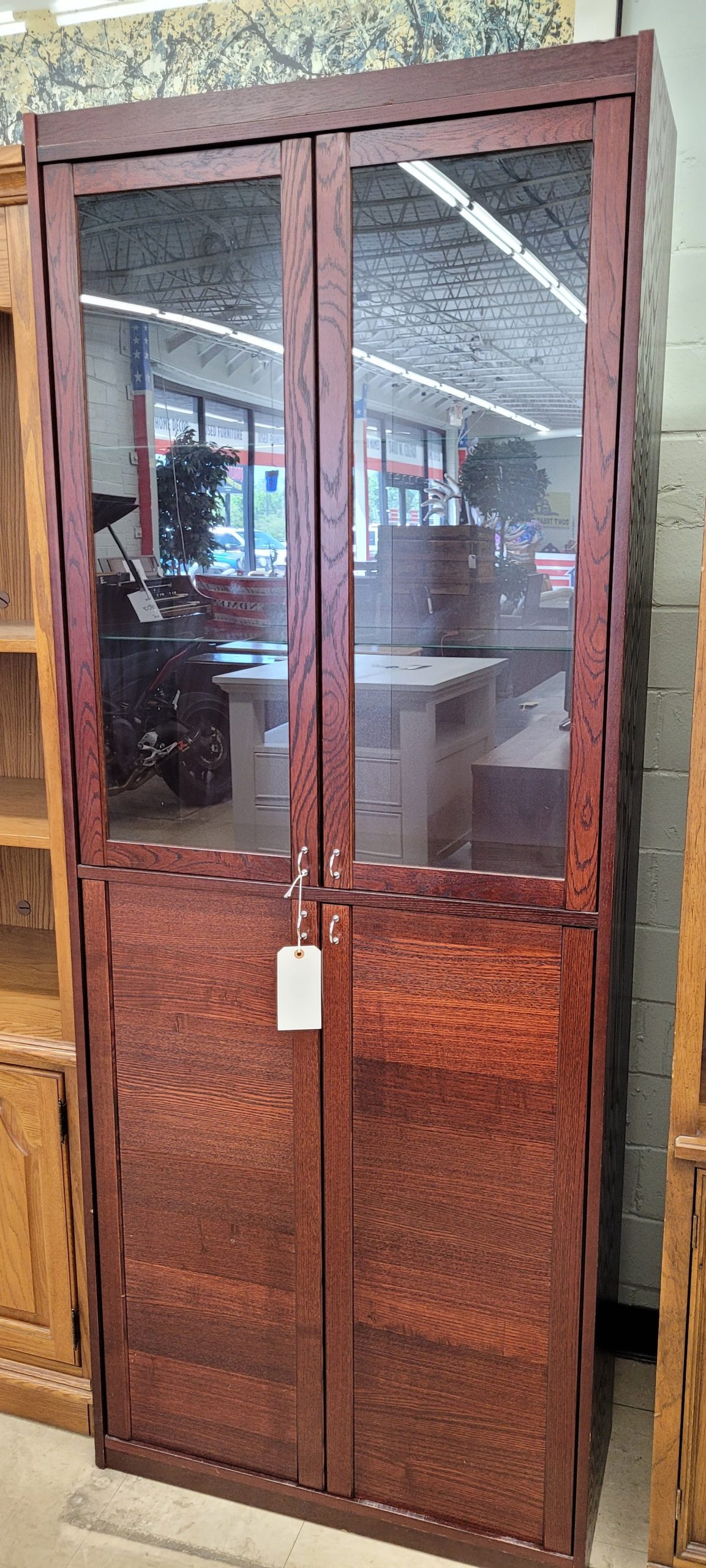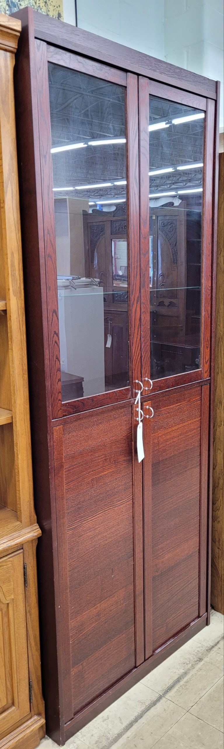 Beautiful cabinet for sale in excellent condition. A nice cherry colored wood makes for a great addition to your room. A display case with shelving up top, and a not-so-display case below. Little modern and sleek handles are a cool accent. From a clean non-smoking home.