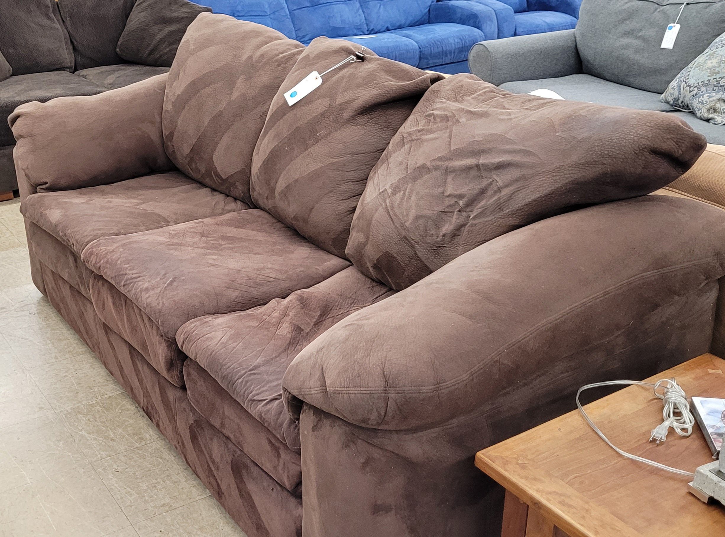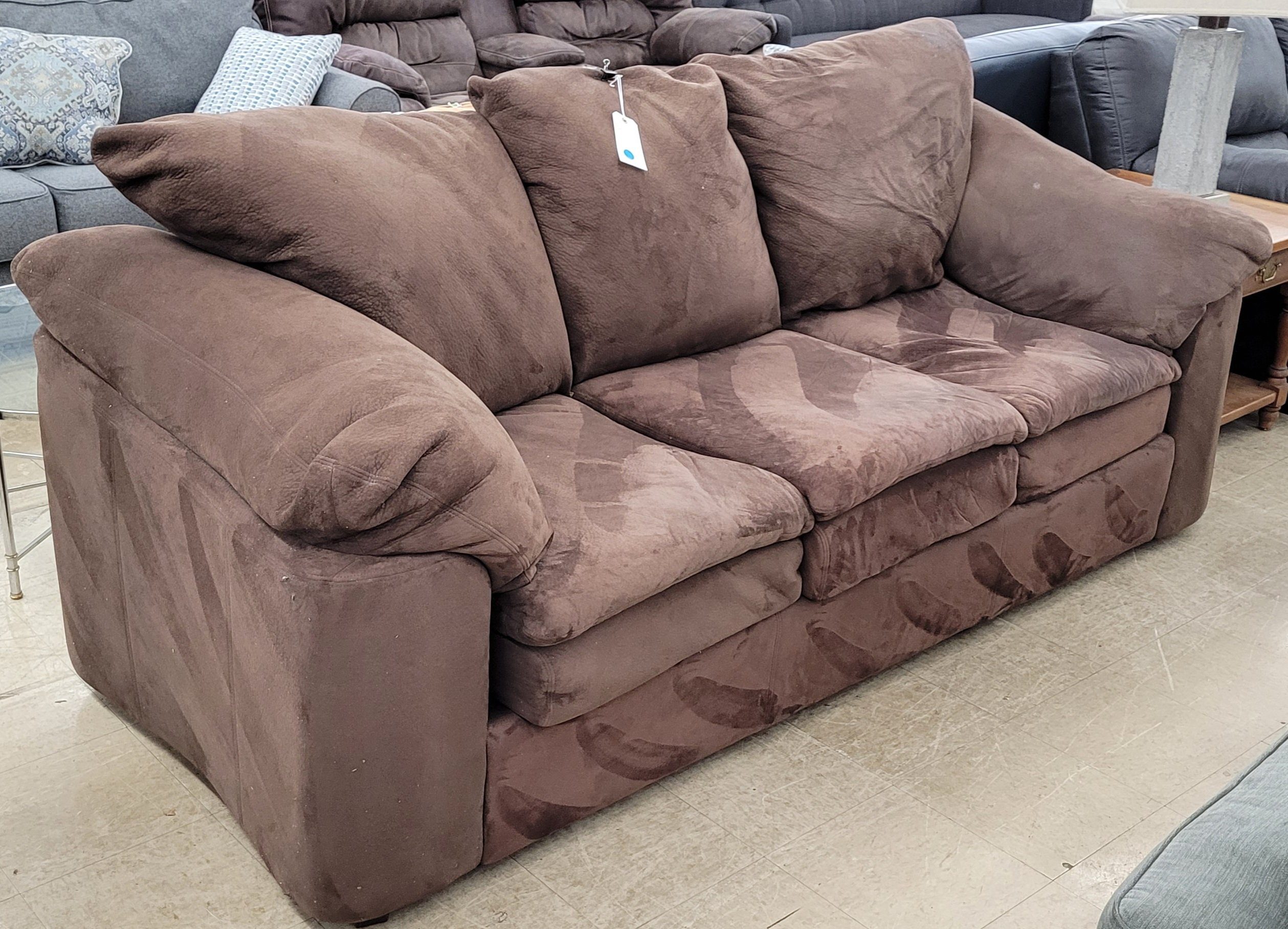 Nice microfiber couch for sale. In good used condition this couch has been loved, but has much more love to give. Fluffy cushions and supportive seating make this a steal. Long enough to lie down on, but still small enough for most rooms. From a clean non-smoking home.