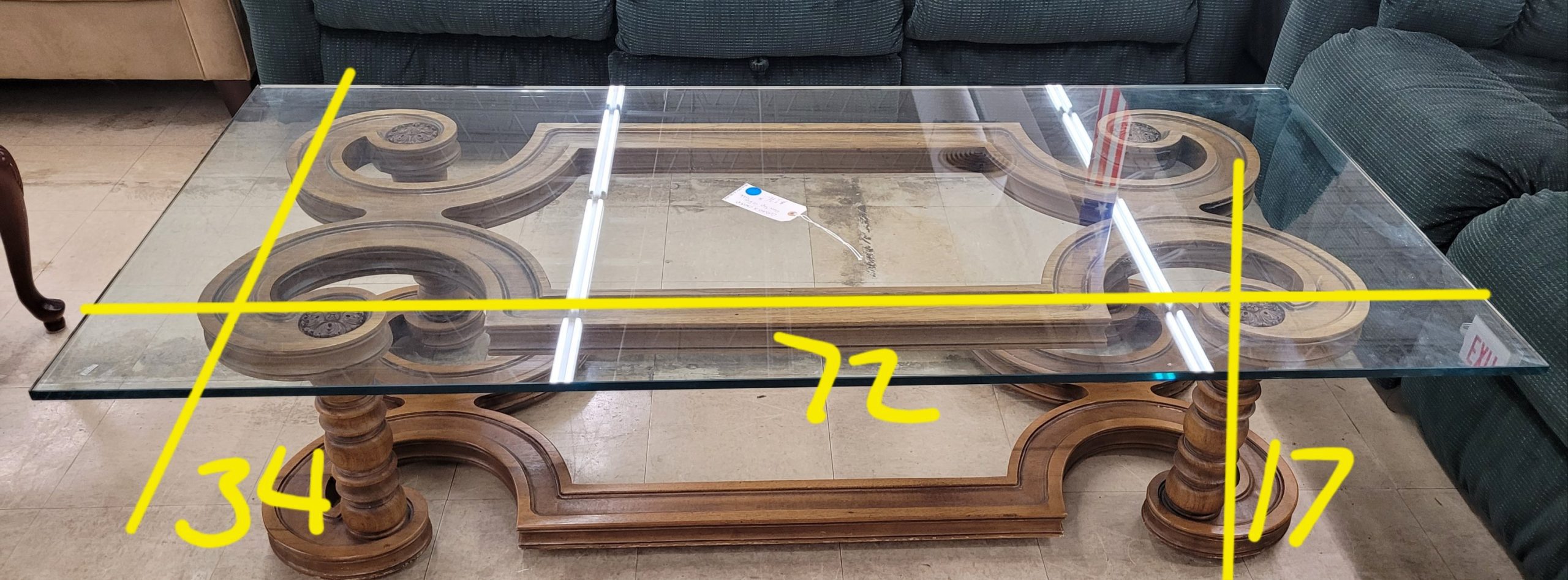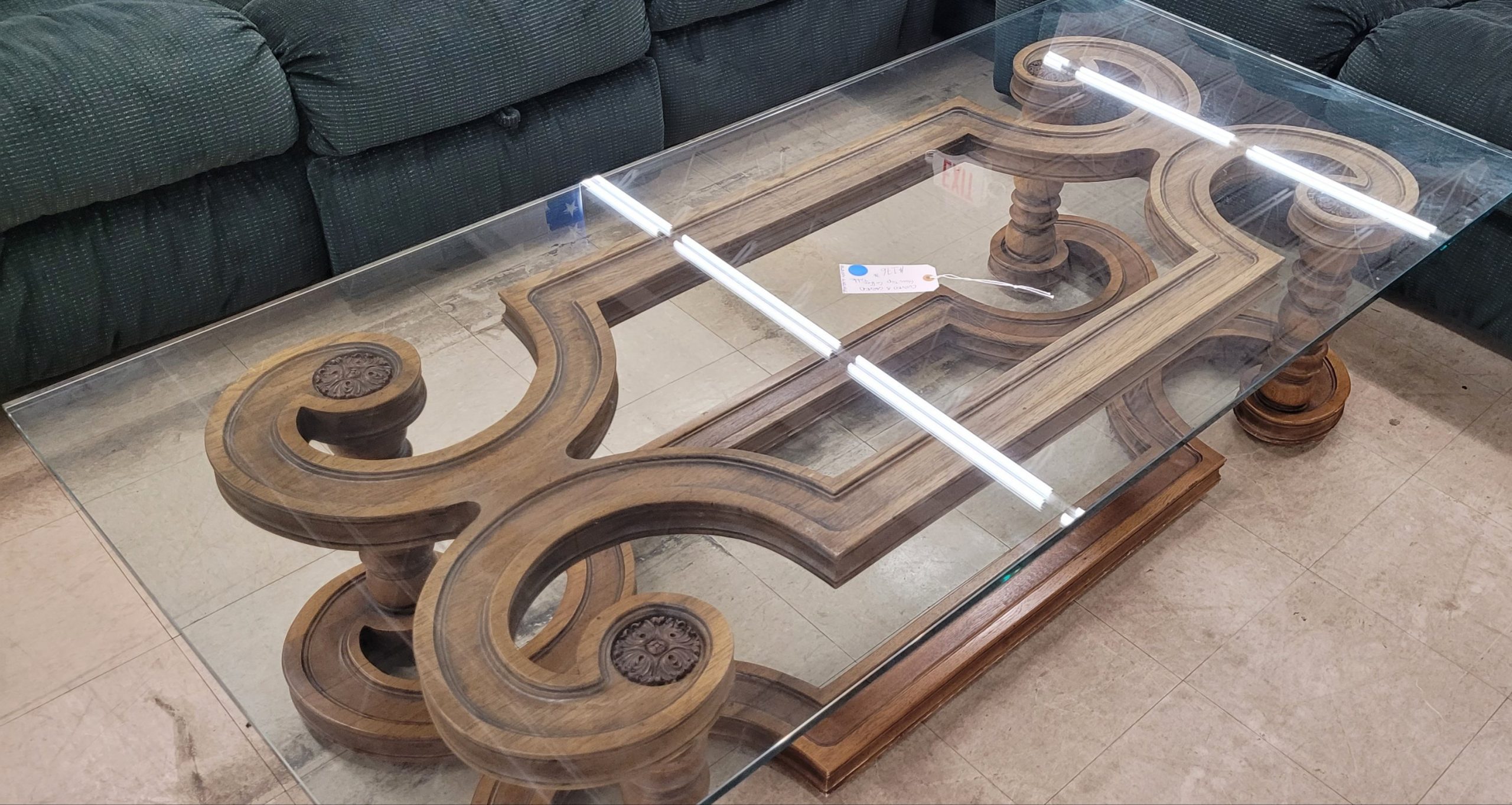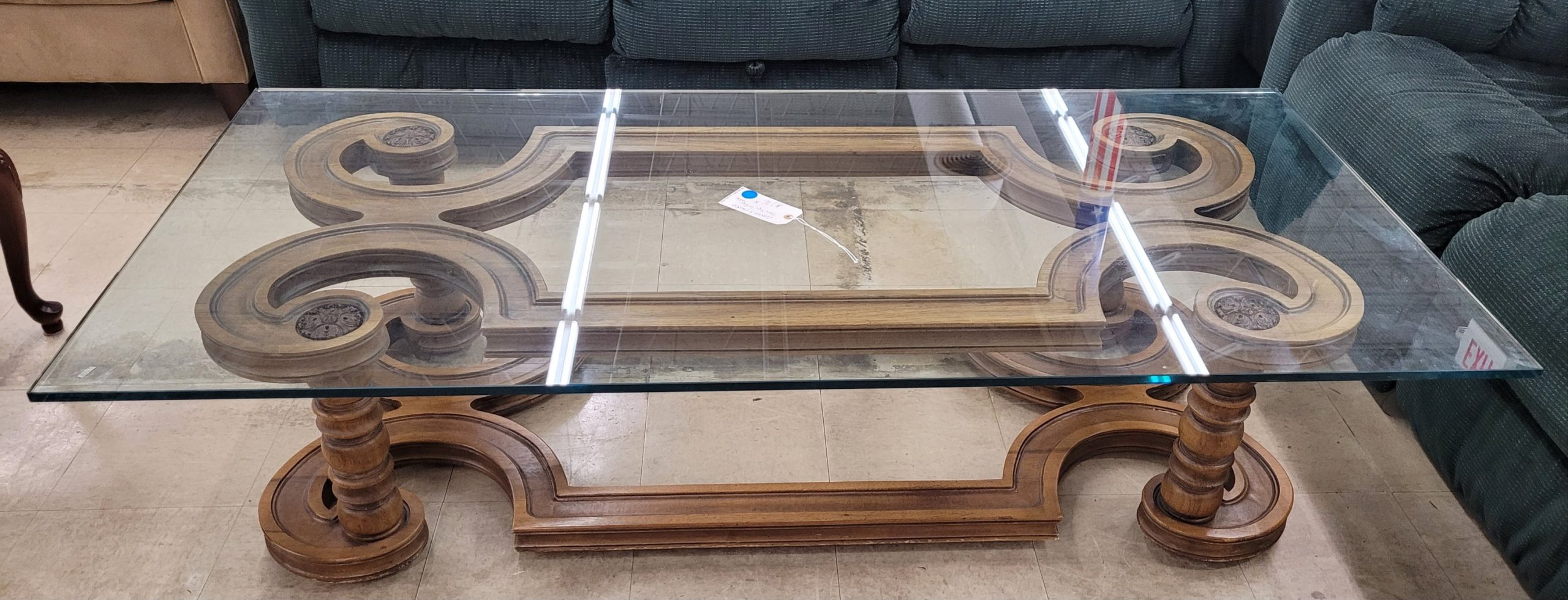Cool coffee table for sale by Thomasville. Nice and curvy, this carved coffee table is in great shape and so is the glass. No chips or knicks on the edges of the table, and only small marring from normal usage. Extra large for extra coverage. From a clean non-smoking home.