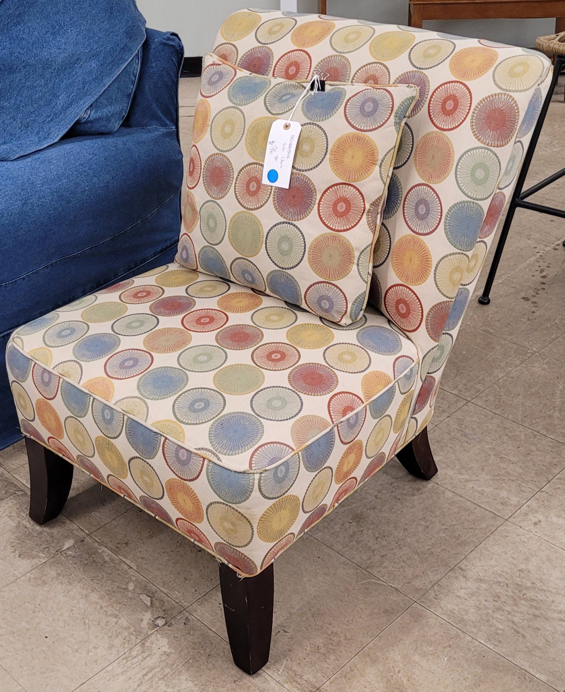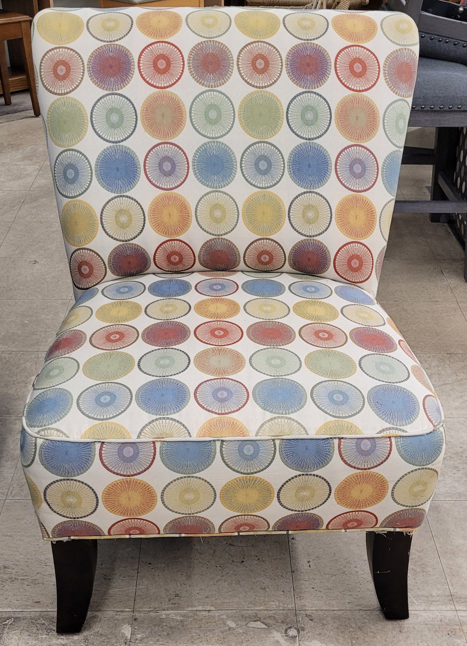 Groovy side chair for sale. In good used condition and straight out of the 70s. Sweet multi colored design which probably wouldn’t do much if you’re color blind. From a clean non-smoking home.