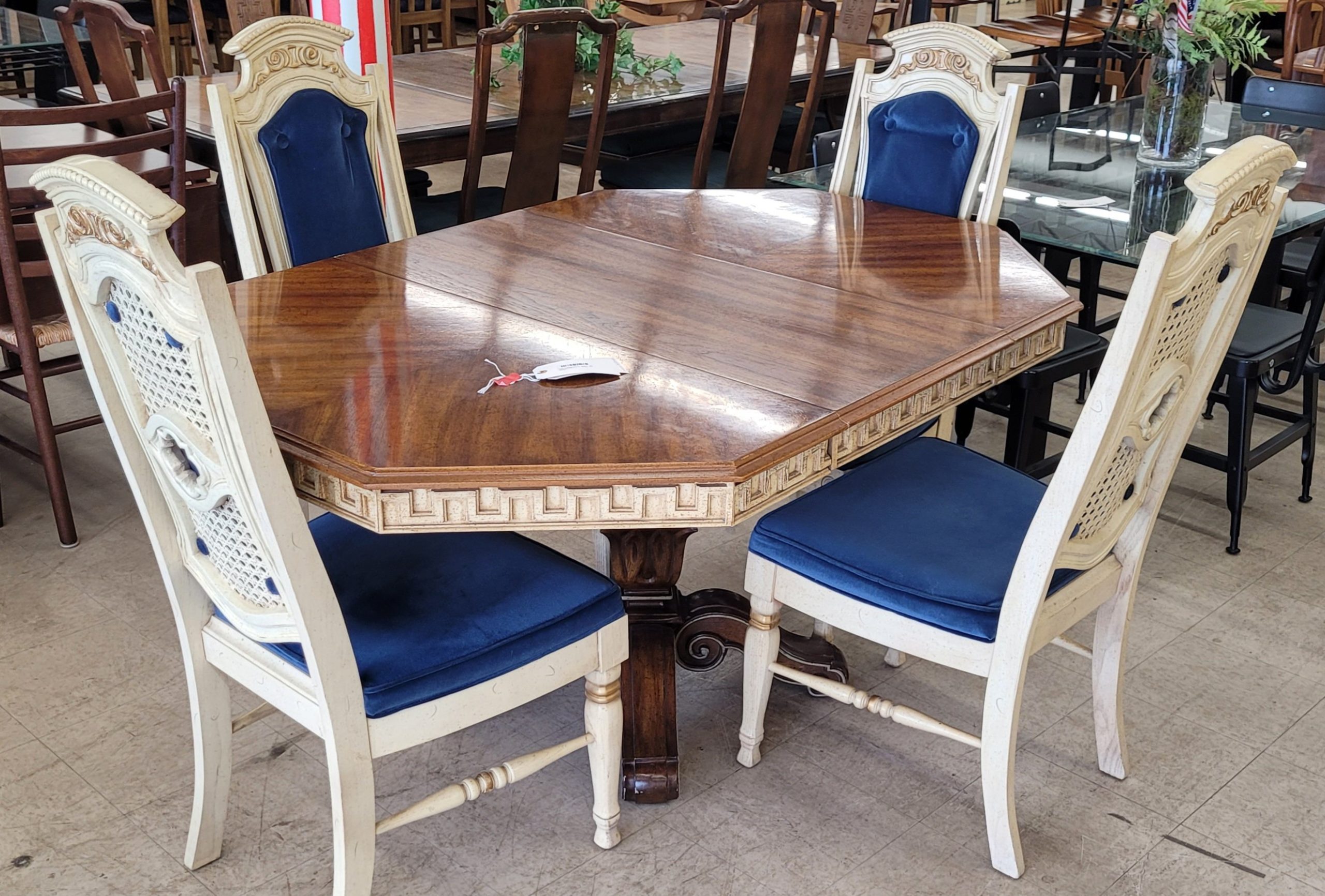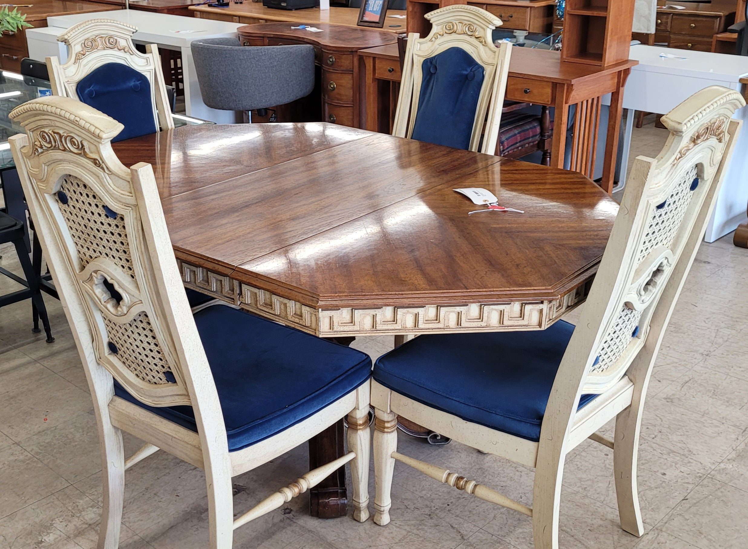 Cool dining set for sale. Set includes table, 4 chairs and a leaf. Made from solid wood and in excellent condition, this set is most assuredly unique. Carved and upholstered chairs that are in good shape with no rips or tears. Cool carving along the side of the table gives it a mosaic look. From a clean non-smoking home.