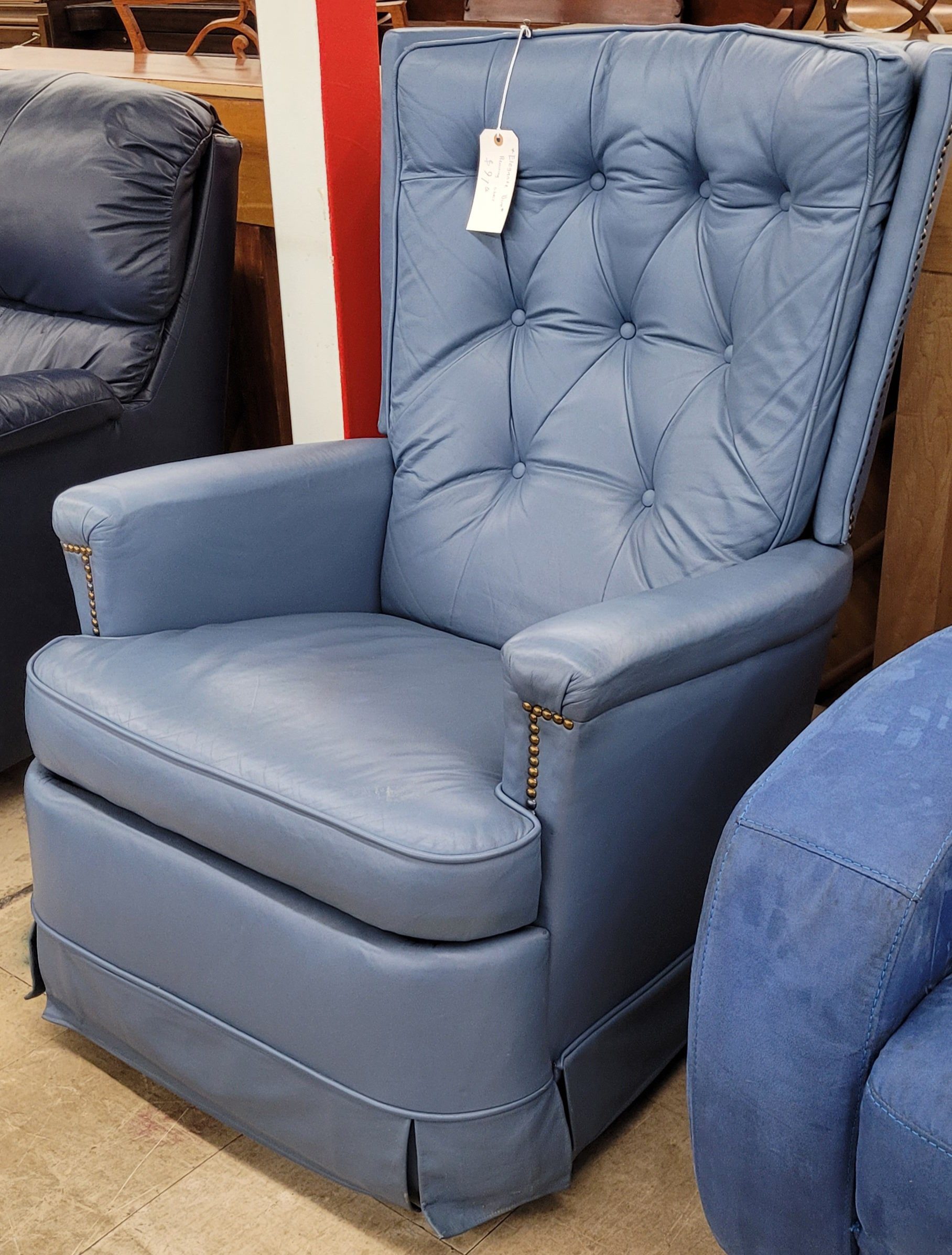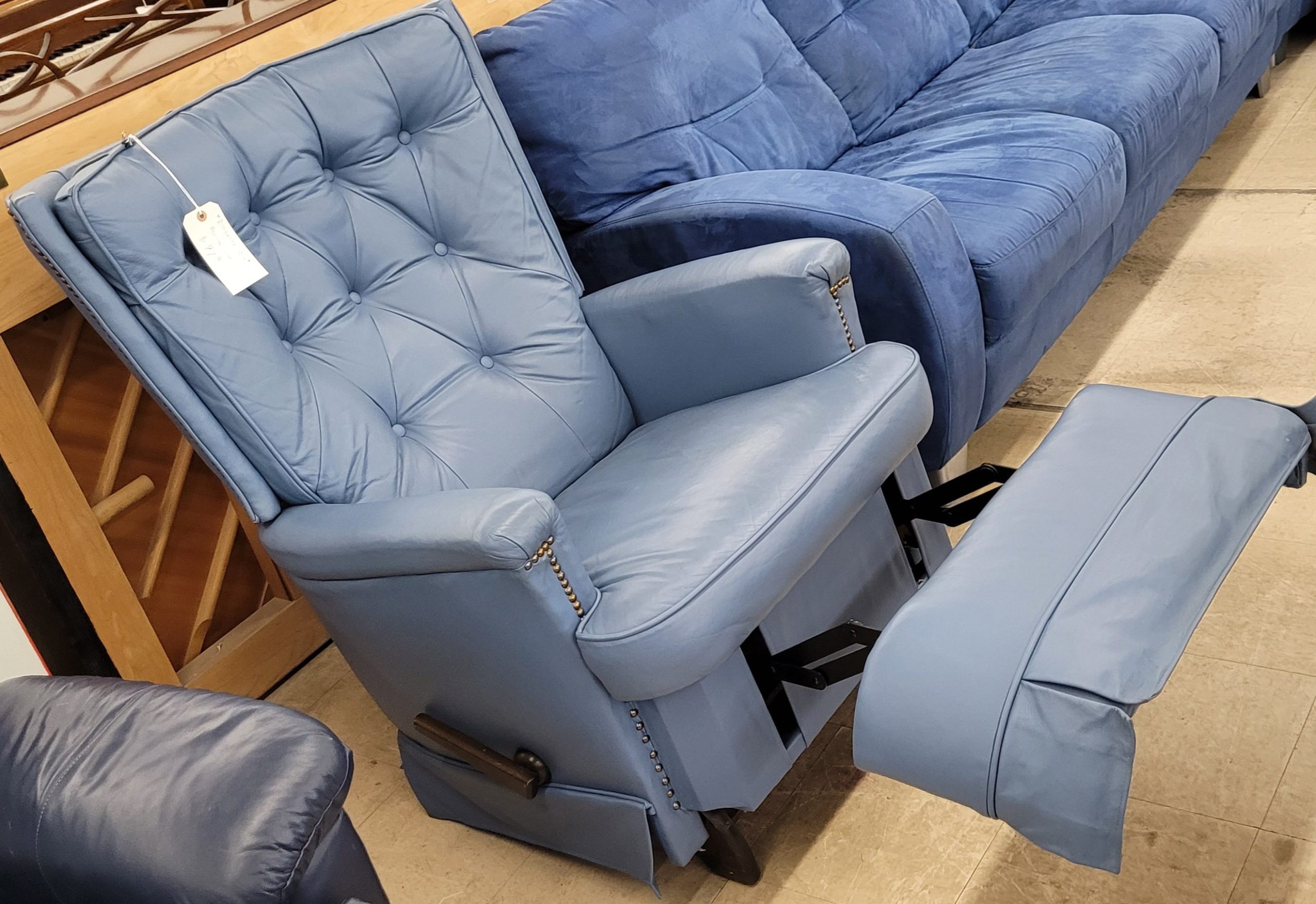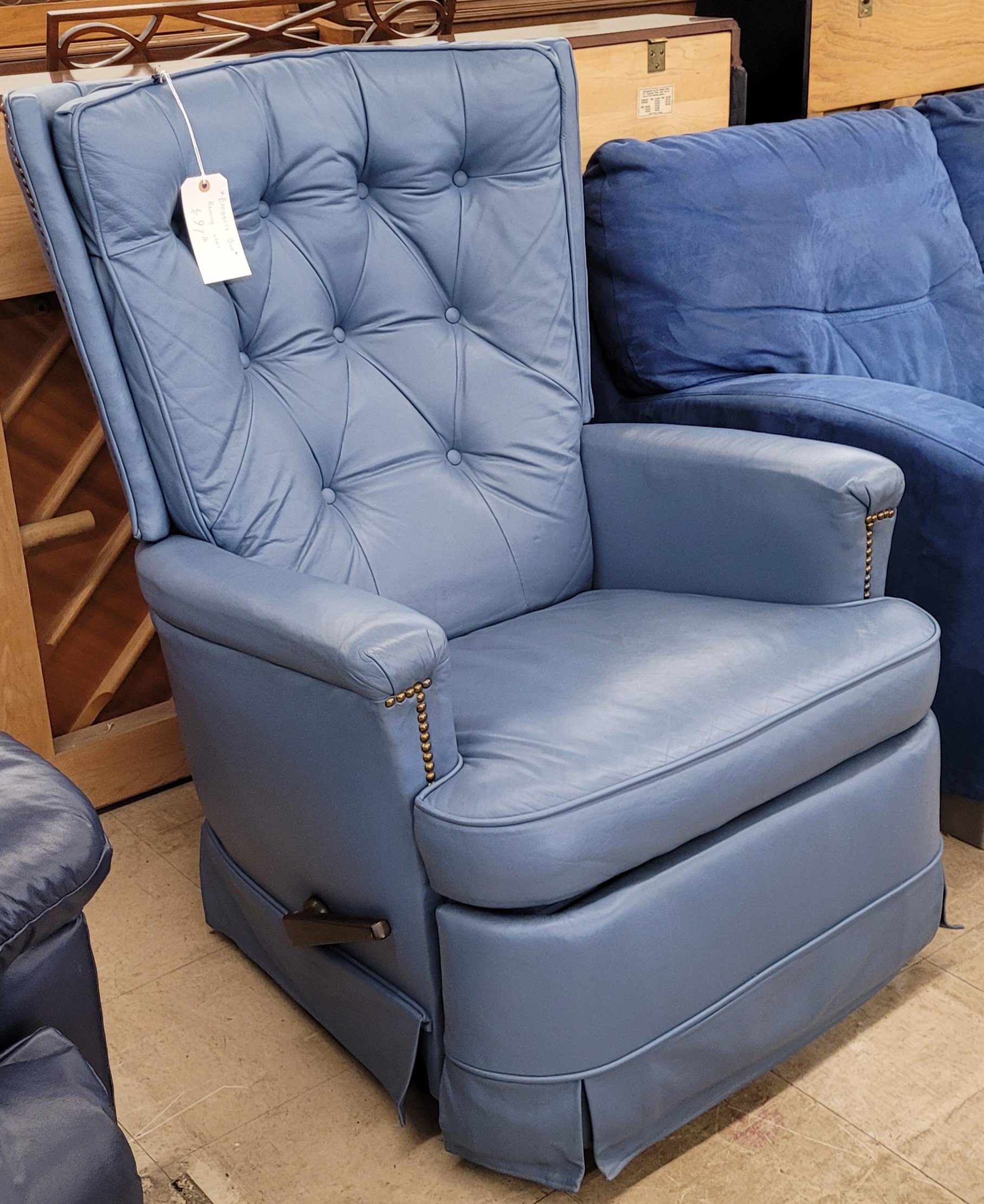 Really comfortable rocking recliner available. Sink right in to this recliner that doubles as a rocker. Lined with nailhead trim, this sky blue chair is available now. Slight wingback at the top for added looks. Tufted back provide plenty of support. From a clean non-smoking home.