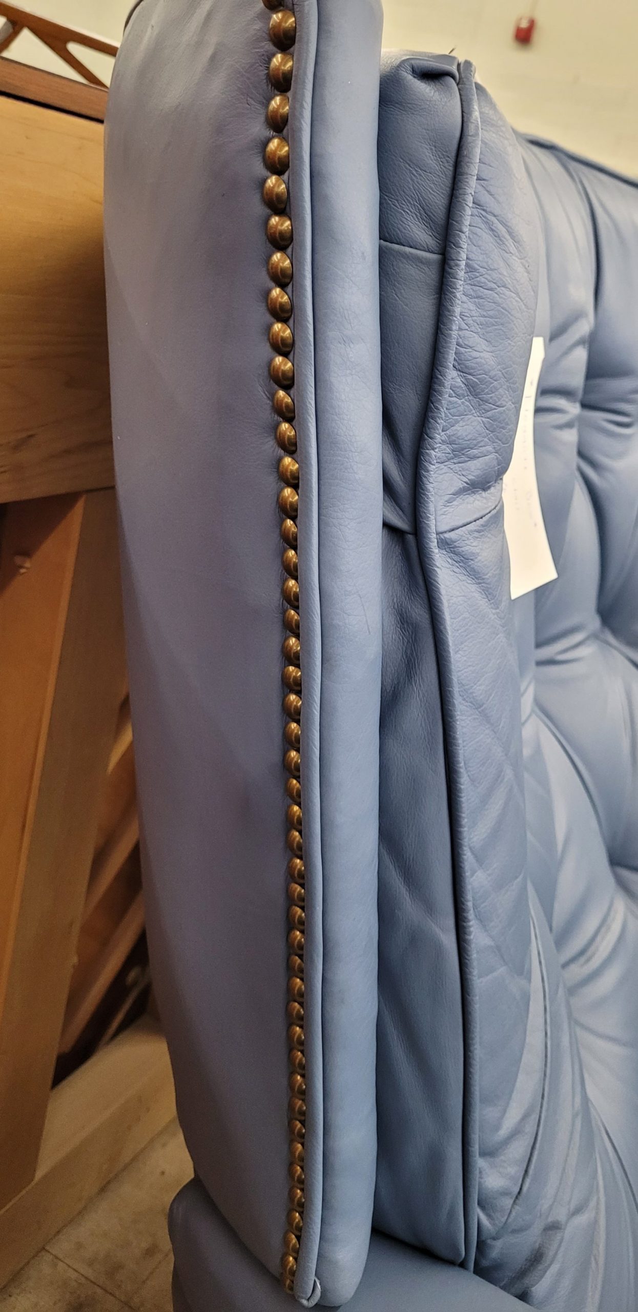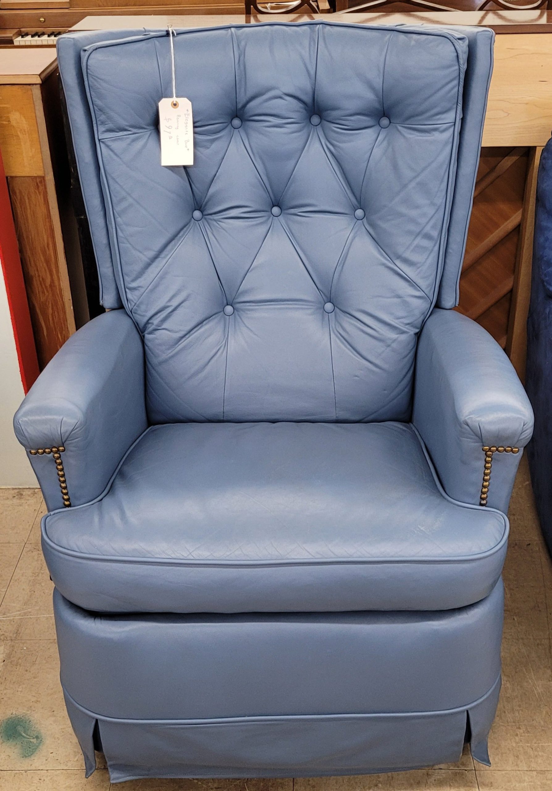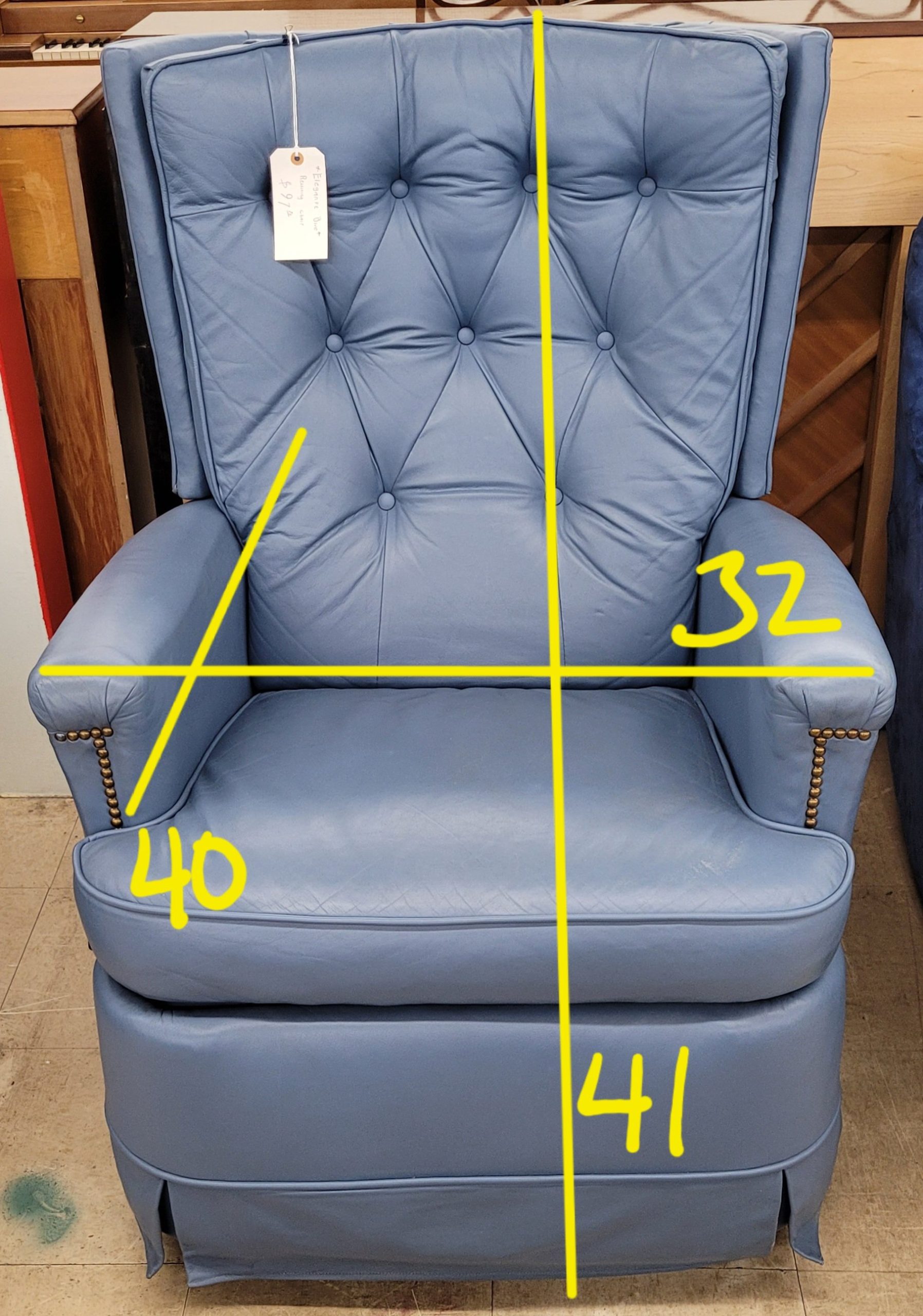 Really comfortable rocking recliner available. Sink right in to this recliner that doubles as a rocker. Lined with nailhead trim, this sky blue chair is available now. Slight wingback at the top for added looks. Tufted back provide plenty of support. From a clean non-smoking home.