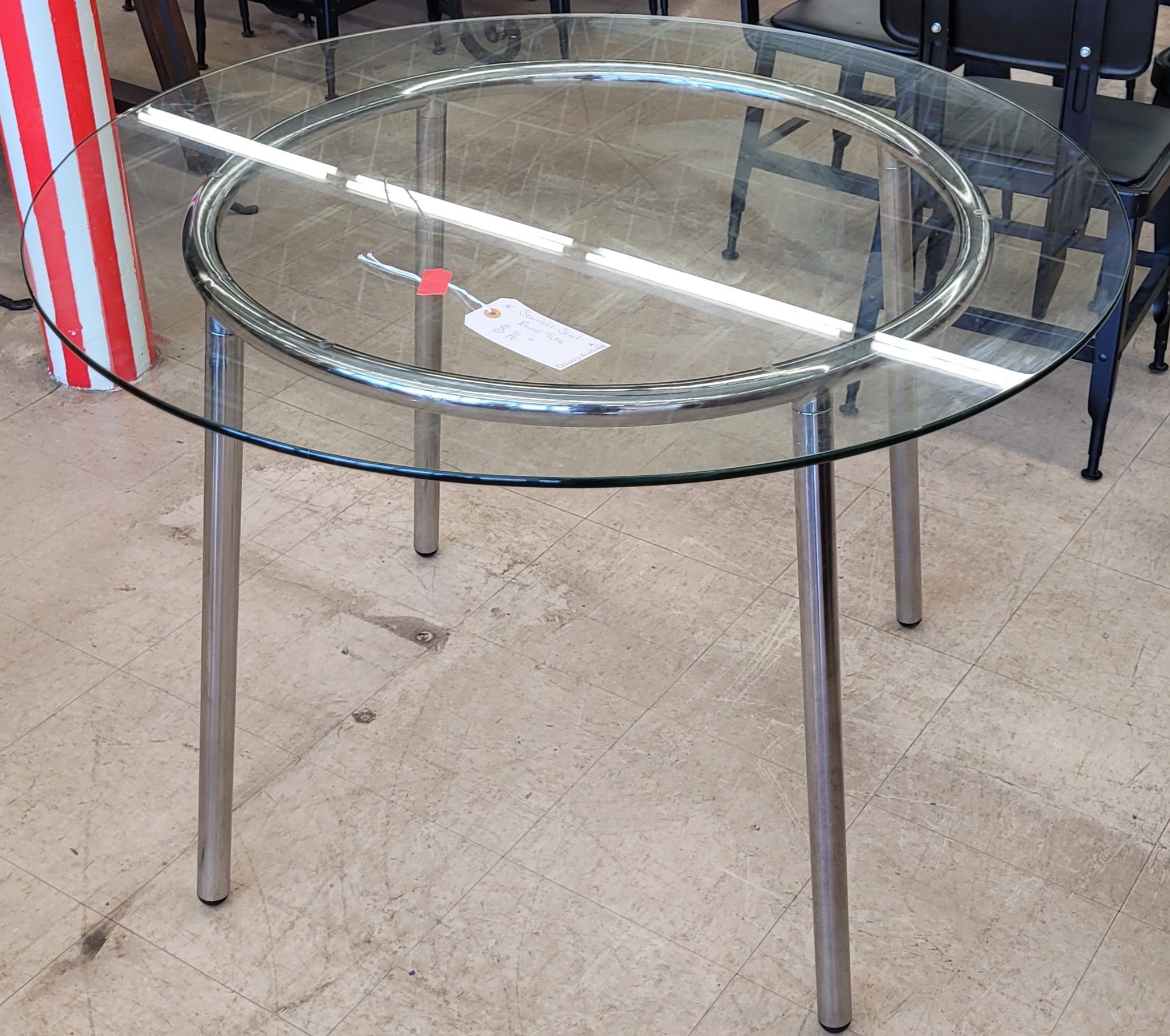 Nice little round glass table for sale. In excellent condition this table is great for any small space and has virtually no marring on the table surface. Steel base that is built to last also has a modern accent to it. From a clean non-smoking home.
