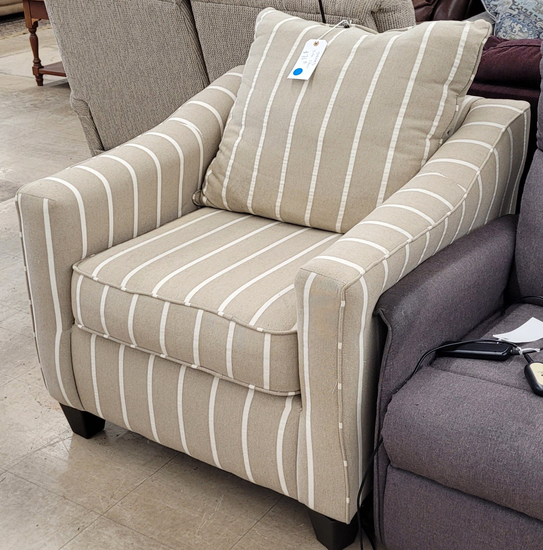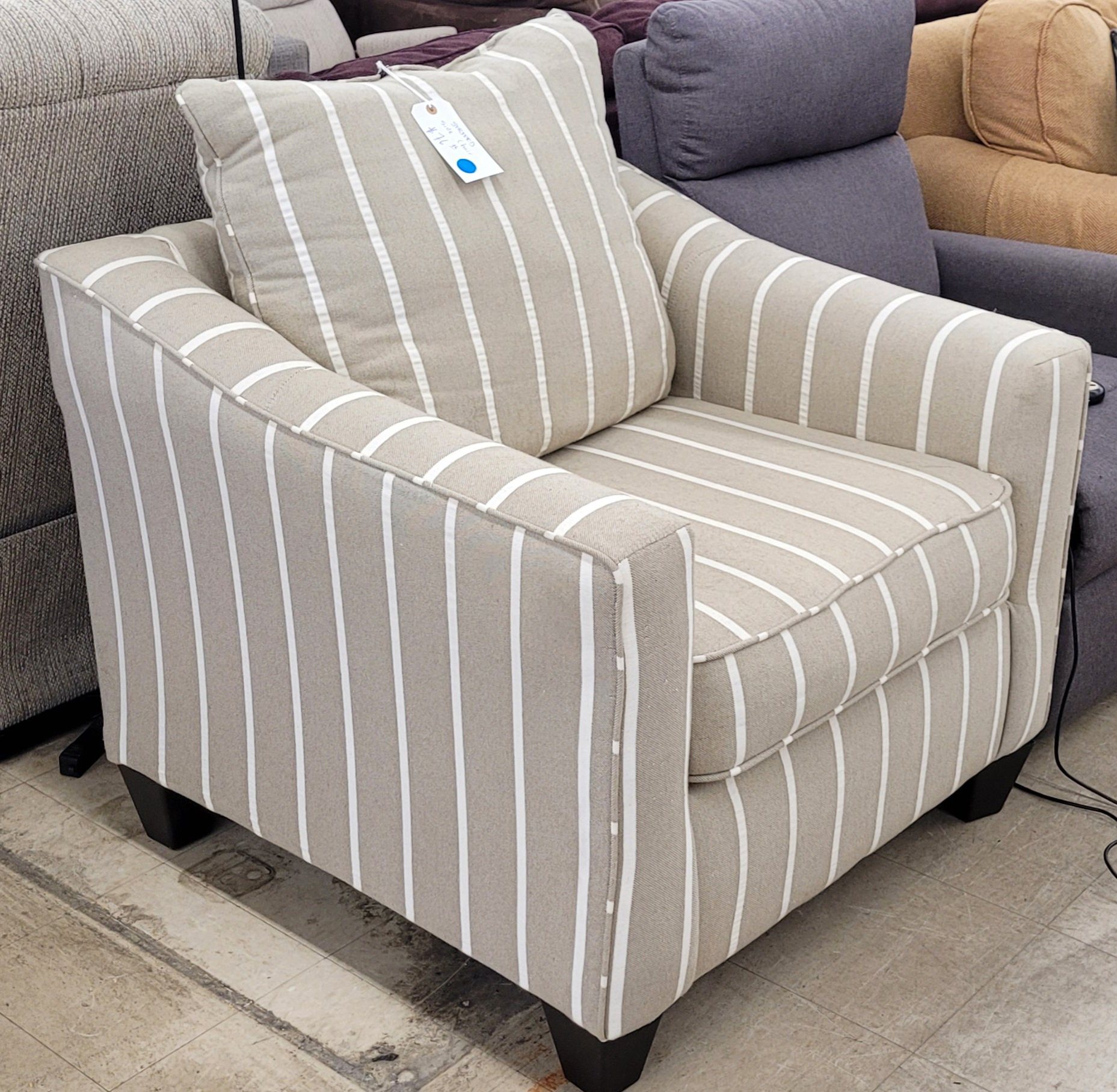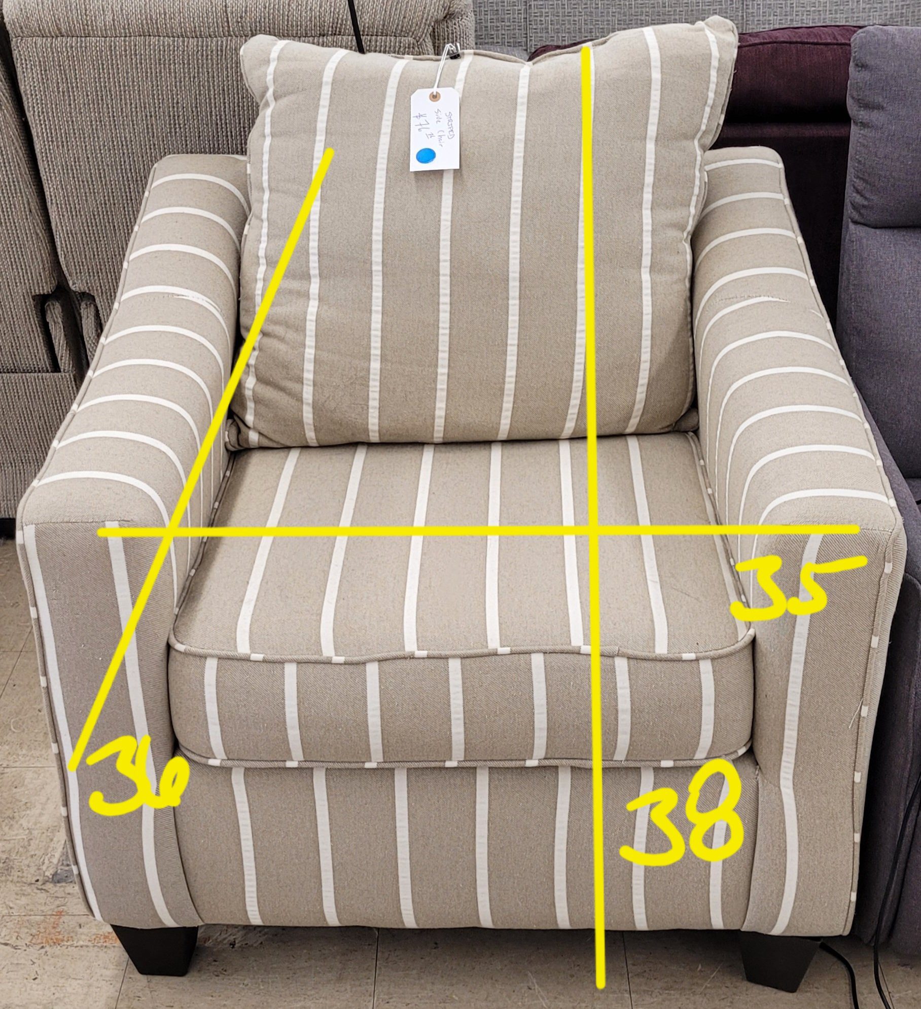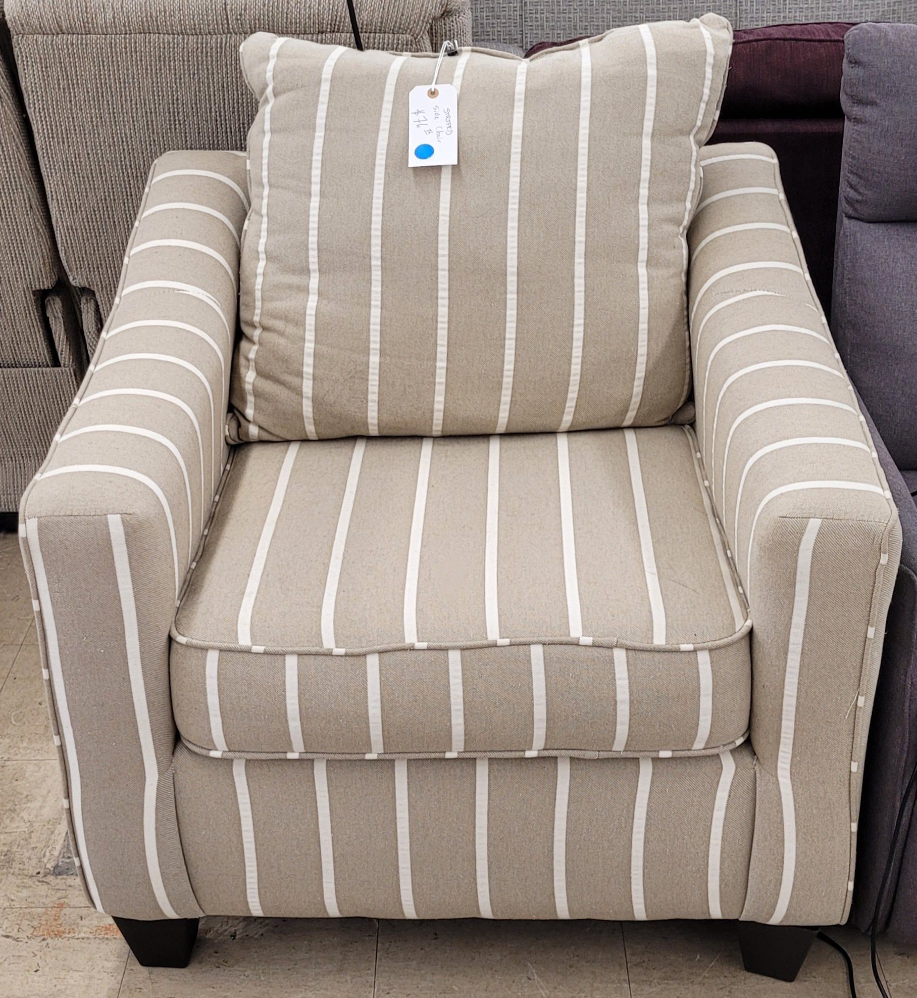 Decorative side chair for sale. Nice and stripey, this chair is in excellent condition. Some minor pilling otherwise fine. Very comfy sit with nice deep cushions that are still supportive. From a clean non-smoking home.