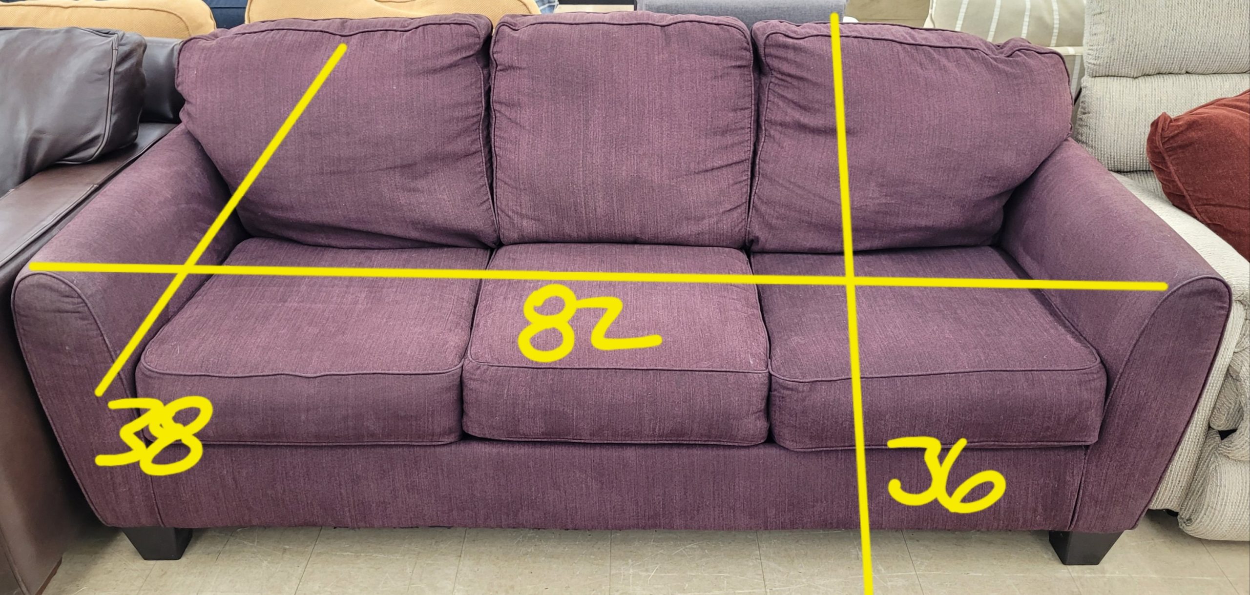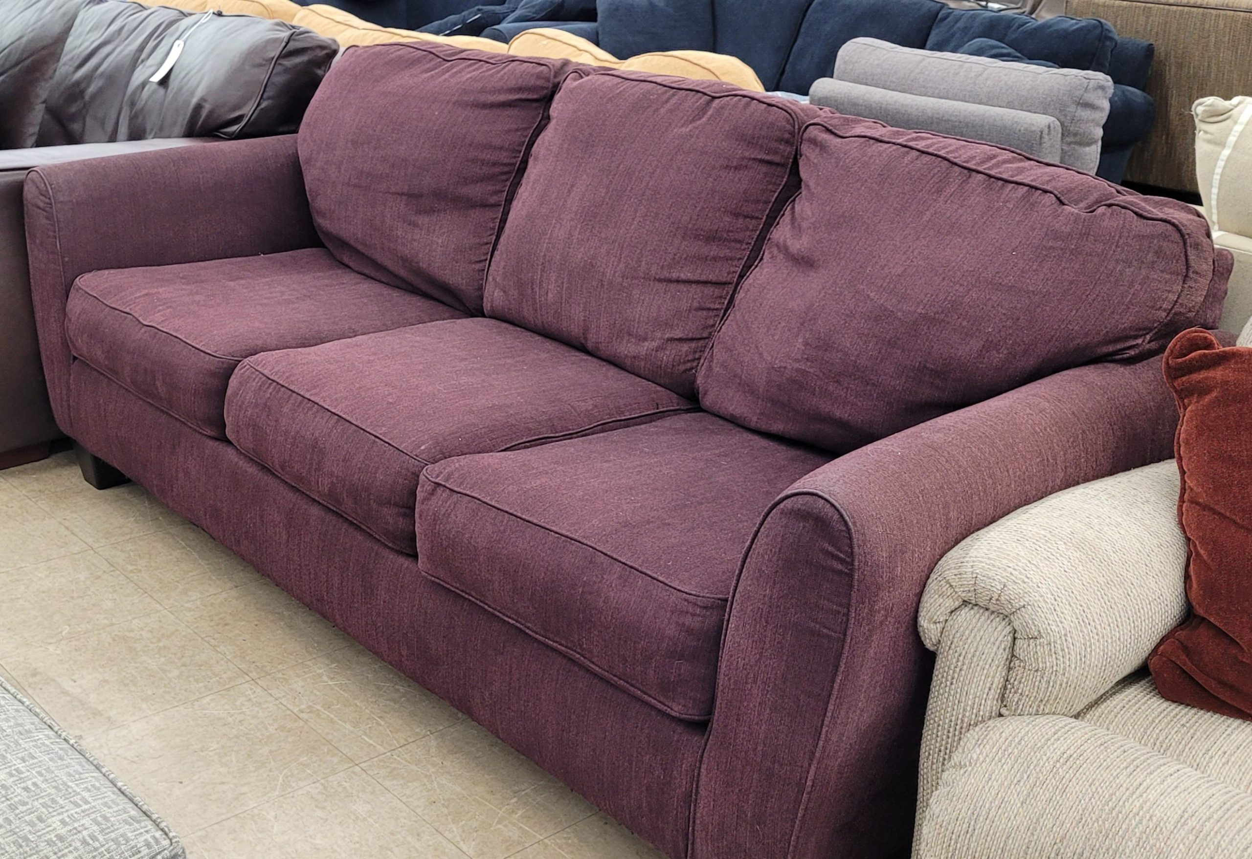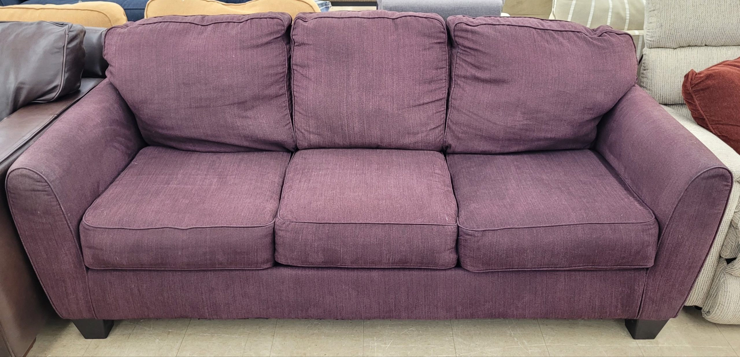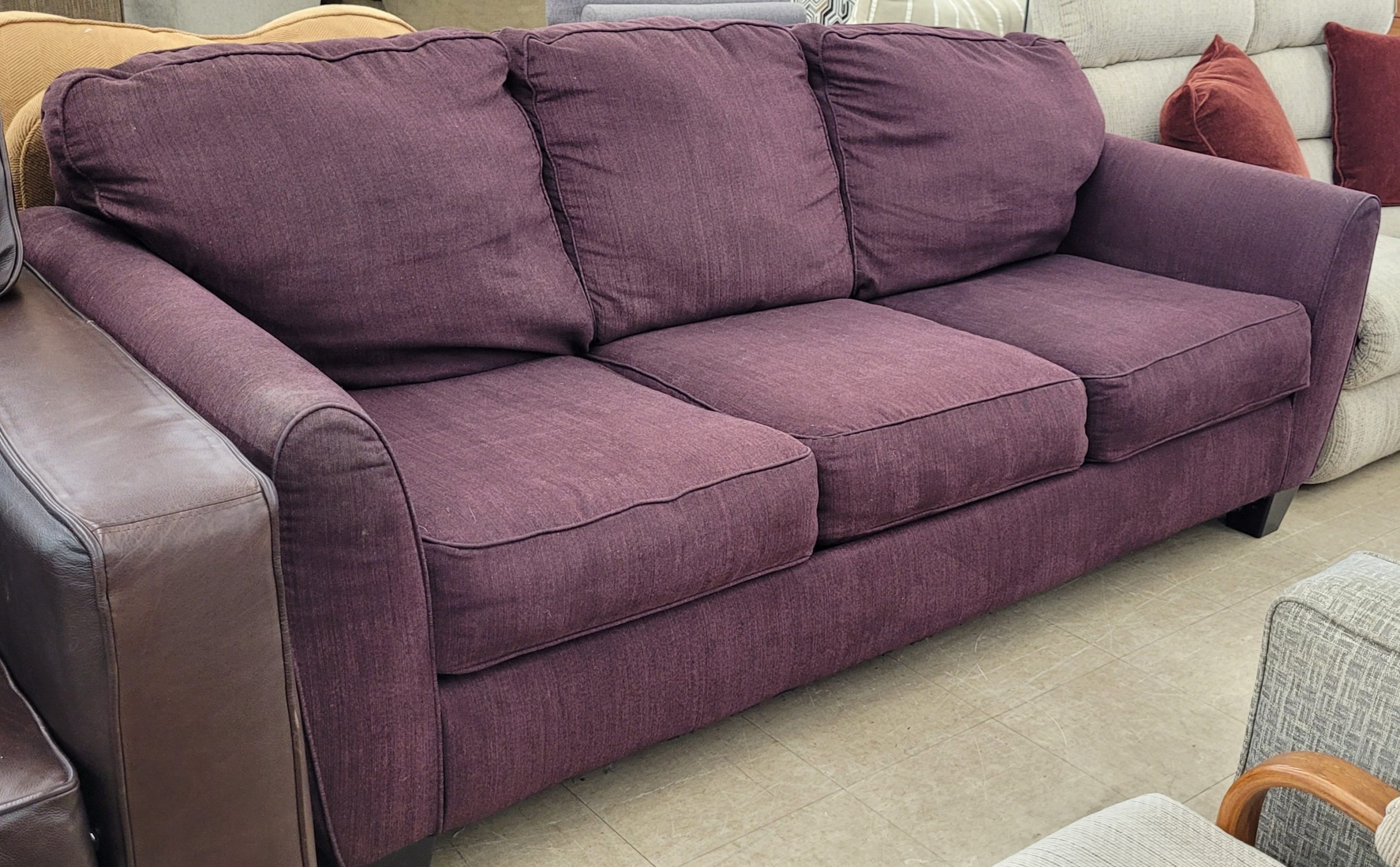 Great purple couch for sale. In good used condition, this couch is wonderfully unique. No rips or tears, this couch can be a great addition to your home. Even better if you’re a red wine drinker! Sink into scomfort on this otherwise great couch. From a clean non-smoking home.
