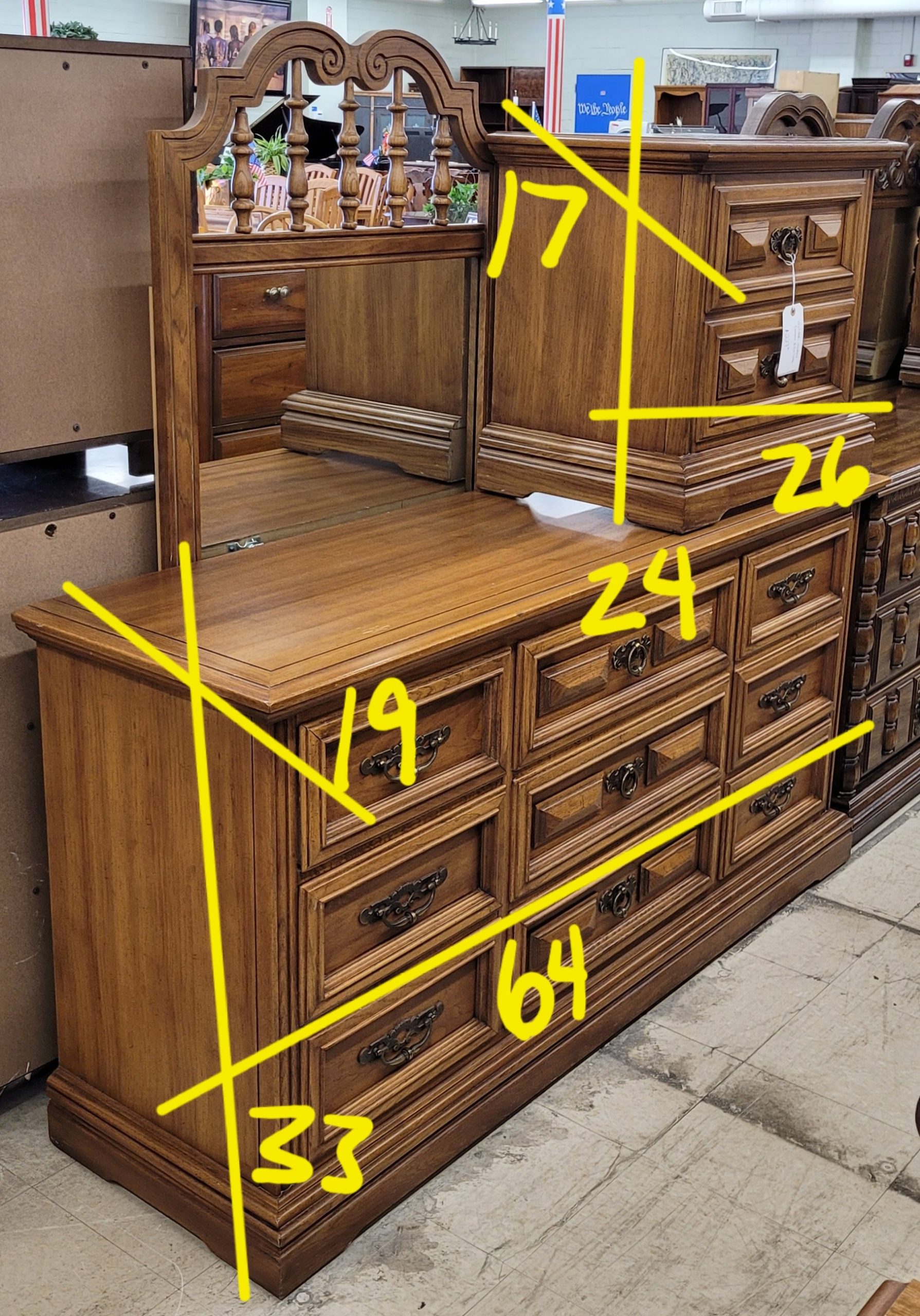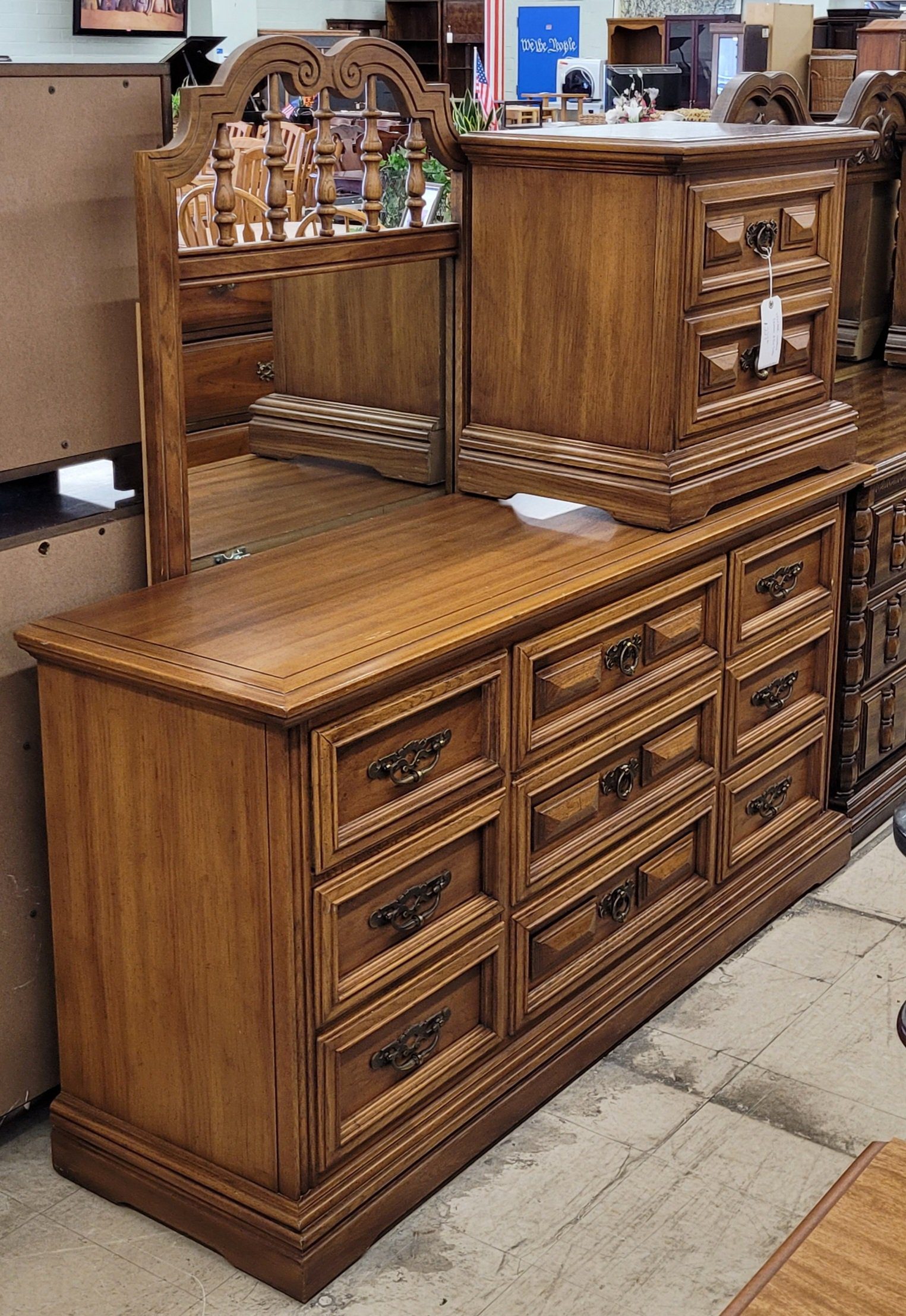 Nice dresser set for sale. Set includes lowboy, nightstand and a vanity mirror. All in excellent condition with fully functioning drawers. The mirror attaches at the back of the lowboy and is also in great condition. From a clean non-smoking home.